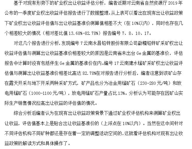 2019年一季度云南省自然资源厅公示矿业权出让收益评估数据比较